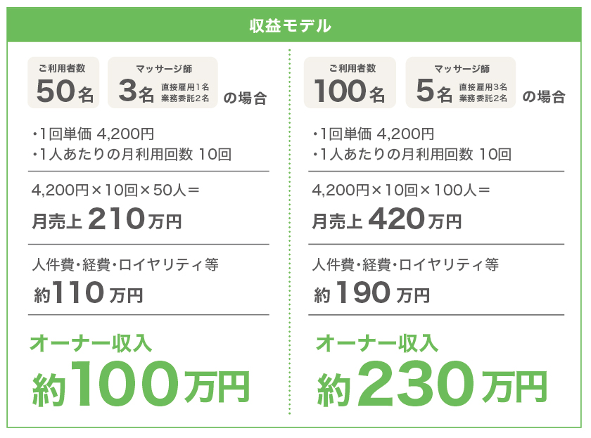 訪問マッサージは、店舗や高額設備が不要のため、開業資金が抑えられ、低リスクでスタートできるのが魅力です。また月々の固定費も少なく、利益率の高い運営が可能です。