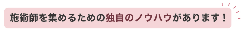 「国家資格者をどうやって採用するの?」というご質問を多くいただきます。ご安心ください。当フランチャイズ本部では、施術師採用のための実践ノウハウをすべてご提供しています。ですからオーナー様自身は経営に専念していただくことができます。